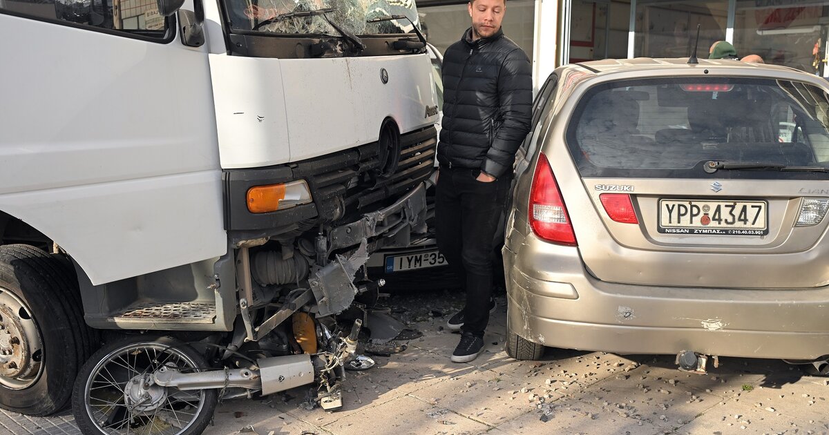 Από τη σύγκρουση τραυματίστηκαν ελαφρά ο οδηγός και ο συνοδηγός του ενώ το φορτηγό συνέχισε την ανεξέλεγκτη πορεία του, έσπασε τα κολωνάκια από το πεζοδρόμιο, παρέσυρε τέσσερα σταθμευμένα μηχανάκια και "καρφώθηκε" σε δύο παρκαρισμένα ΙΧ.