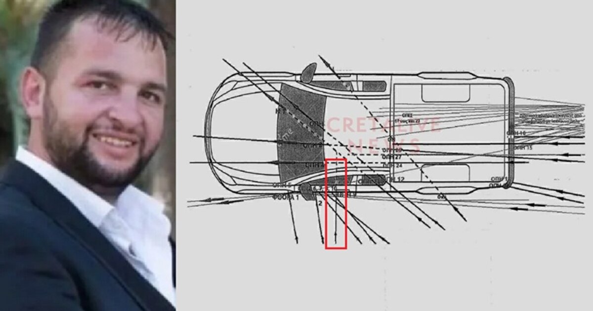 Το τεχνικό διάγραμμα της βλητικής διερεύνησης από τη ΔΕΕ απεικονίζει την κατεύθυνση και την πυκνότητα των πυρών που δέχθηκε το όχημα του 39χρονου Φανούρη Καργάκη