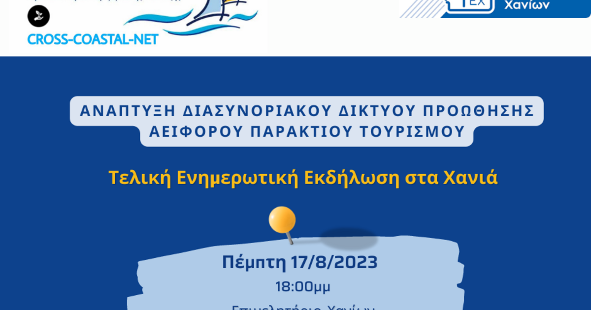 To Επιμελητήριο Χανίων, ως επικεφαλής εταίρος του έργου με τίτλο «Ανάπτυξη Διασυνοριακού Δικτύου Προώθησης Αειφόρου Παράκτιου Τουρισμού» και ακρωνύμιο CROSS-COASTAL-NET, διοργανώνει την Τελική Ενημερωτική Εκδήλωση του έργου στα Χανιά την Πέμπτη 17 Αυγούστου στις 18:00μμ στην αίθουσα Διοικητικού Συμβουλίου του Επιμελητηρίου.