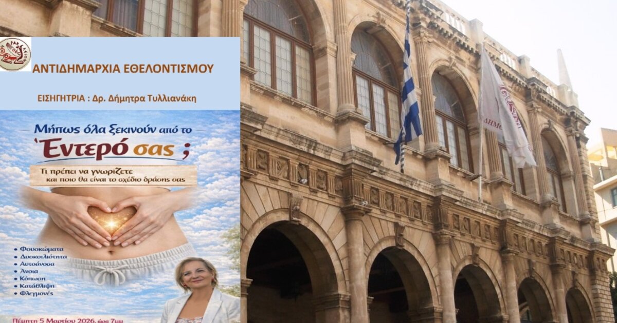 Ενημερωτική εκδήλωση με θέμα «Μήπως όλα ξεκινούν από το έντερό σας;» διοργανώνει η Αντιδημαρχία Εθελοντισμού του Δήμου Ηρακλείου την Πέμπτη 5 Μαρτίου στις 19:00 στην αίθουσα «Μανόλης Καρέλλης» στο δημοτικό κτίριο της Ανδρόγεω.