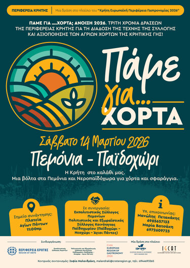 Σας στέλνω προς δημοσιοποιίηση ενημερωτικό υλικό σχετικά με το πρόγραμμα «ΠΑΜΕ ΓΙΑ ….ΧΟΡΤΑ; ΑΝΟΙΞΗ 2026», για τη διάδοση της τέχνης της συλλογής και αξιοποίησης των άγριων χόρτων της κρητικής γης, μαζί με τις αφίσες που αφορούν στις δράσεις της 14 Μαρτίου (Πεμόνια - Παïδοχώρι) και 15 Μαρτίου (Κιθαρίδα Μαλεβιζίου & Δρακώνα)