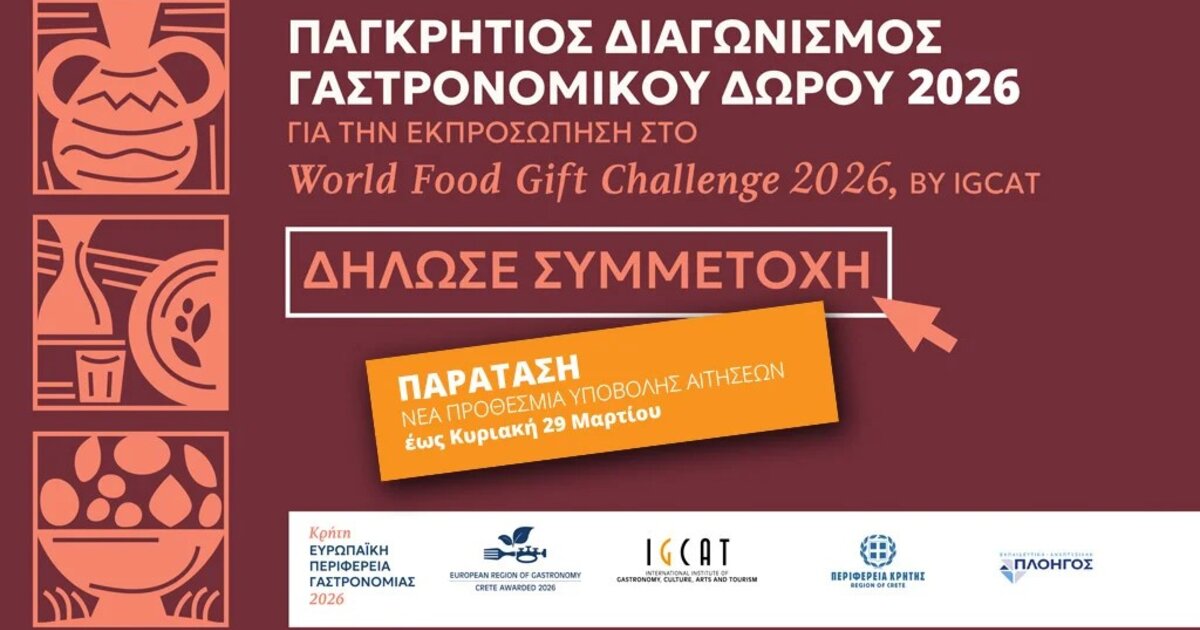 Παρατείνεται η προθεσμία υποβολής υποψηφιοτήτων για τον Παγκρήτιο Διαγωνισμό Γαστρονομικού Δώρου 2026, δίνοντας τη δυνατότητα σε ακόμη περισσότερους δημιουργούς και παραγωγούς της Κρήτης να συμμετάσχουν και να αναδείξουν τα μοναδικά γαστρονομικά προϊόντα και δώρα του νησιού.