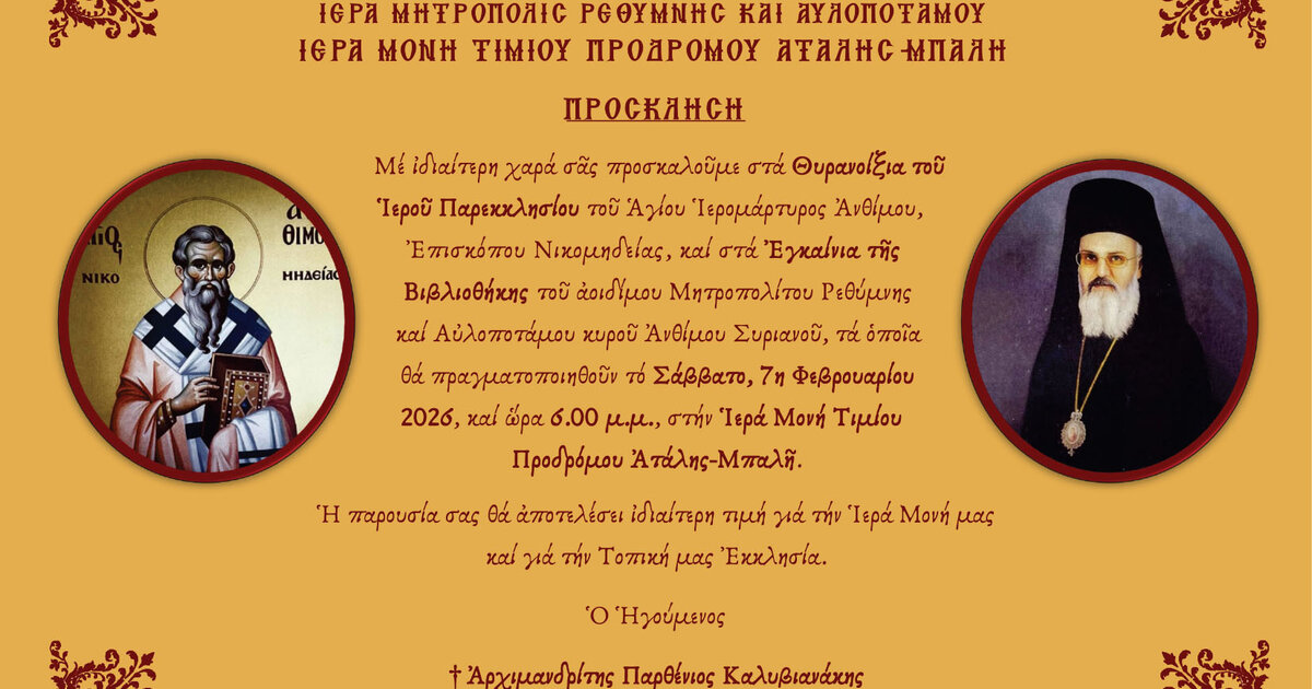 Το Σάββατο 7 Φεβρουαρίου, στις 6 το απόγευμα, αναμένεται να πραγματοποιηθούν τα Θυρανοίξια του Ιερού Παρεκκλησίου του Αγίου Ιερομάρτυρος Ανθίμου, Επισκόπου Νικομηδείας, και τα Εγκαίνια της Βιβλιοθήκης του αοιδίμου Μητροπολίτου Ρεθύμνης και Αυλοποτάμου κυρού Ανθίμου Συριανού, στην Ιερά Μονή Τιμίου Προδρόμου Ατάλης-Μπαλή.