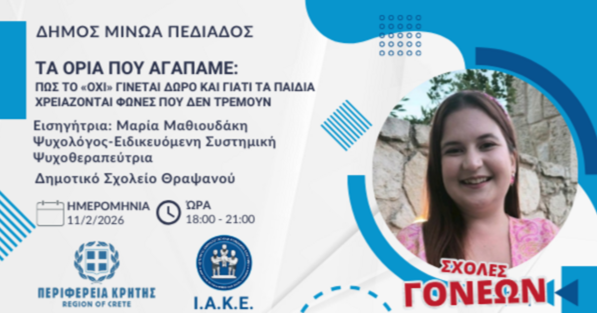 Η συνάντηση στο Θραψανό θα πραγματοποιηθεί την Τετάρτη 11 Φεβρουαρίου 2026, από τις 18:00 έως τις 21:00, στο χώρο του Δημοτικού Σχολείου Θραψανού, με θέμα: «Τα όρια που αγαπάμε: Πώς το “όχι” γίνεται δώρο και γιατί τα παιδιά χρειάζονται φωνές που δεν τρέμουν».