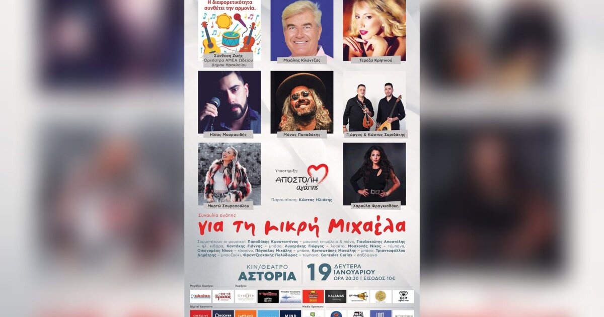 Μια μεγάλη φιλανθρωπική συναυλία αγάπης και αλληλεγγύης διοργανώνεται τη Δευτέρα 19 Ιανουαρίου 2026, στον Κινηματογράφο Αστόρια, με σκοπό την οικονομική ενίσχυση άπορης οικογένειας και ειδικότερα της μικρής Μιχαέλας, ενός τρίχρονου κοριτσιού που αντιμετωπίζει σοβαρό και άμεσο κίνδυνο απώλειας της όρασής της.