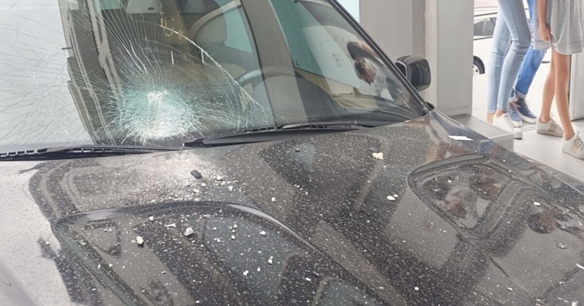 Τα κομμάτια που έπεσαν προκάλεσαν υλικές ζημιές το παρμπρίζ του ΙΧ, όπως μεταδίδει το kriti24.gr.
