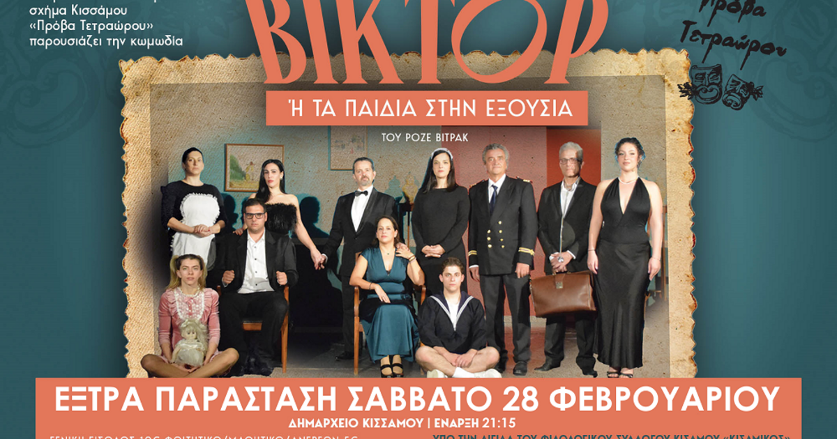 Μετά από 7 επιτυχημένες, sold out παραστάσεις, η ερασιτεχνική θεατρική ομάδα της Κισσάμου “Πρόβα τετραώρου”, σας προσκαλεί σε μία τελευταία έξτρα παράσταση της εμβληματικής κωμωδίας του Ροζέ Βιτράκ, “Βικτόρ ή τα παιδιά στην εξουσία”, το Σάββατο 28 Φεβρουαρίου στις 21:15 στο Δημαρχείο Κισσάμου.