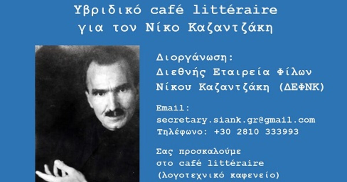 Η δεύτερη συνάντηση του υβριδικού "Café littéraire" (λογοτεχνικό καφενείο) για τον Νίκο Καζαντζάκη θα πραγματοποιηθεί διαδικτυακά, την Τετάρτη, 7 Μαΐου, 2025, στις 20:00 το βράδυ, με θέμα ομιλίας: «Γλωσσάρι στο έργο του Νίκου Καζαντζάκη».