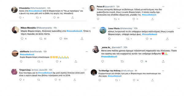 Διθυραμβικά και συναισθηματικά tweets για τις εμπειρίες και το μεγαλείο της Μαρίας Φαραντούρη, την τηλεοπτική επιστροφή του Αλκίνοου Ιωαννίδη, και τη θαυμαστή ταπεινότητα και των δύο.
