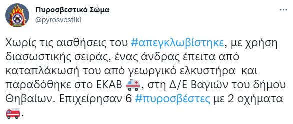 Επενέβησαν έξι πυροσβέστες με 2 οχήματα από την ΠΥ Θήβας, για να τον απεγκλωβίσουν, δυστυχώς όμως ανασύρθηκε νεκρός.