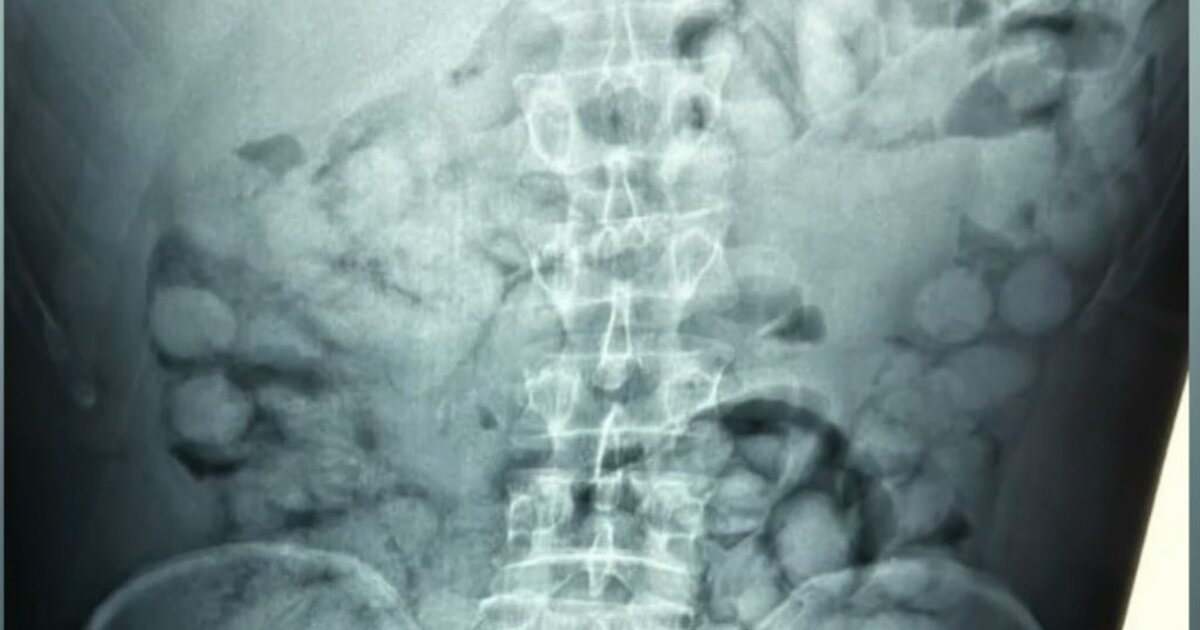 Στις ακτινογραφίες που έδωσε στη δημοσιότητα η Ελληνική Αστυνομία, διακρίνονται οι συσκευασίες που είχε καταπιεί με τους γιατρούς να εντοπίζουν 100 κάψουλες των 11 γραμμαρίων η καθεμία.