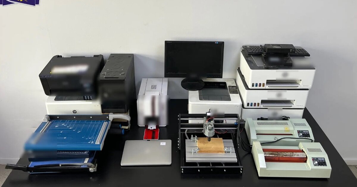 εξοπλισμός, όπως 2 ηλεκτρονικοί υπολογιστές, 6 πολυμηχανήματα – εκτυπωτές, 2 πλαστικοποιητές – θερμοκολλητές, 4 επιτραπέζιοι κόφτες χειρός, ηλεκτρονική συσκευή εγχάραξης διαφανειών CNC, συσκευή ανίχνευσης πλαστών εγγράφων UV, 8 ρολά ιριδίζουσας ταινίας, πλήθος αφαιρούμενων ψηφιακών μέσων,