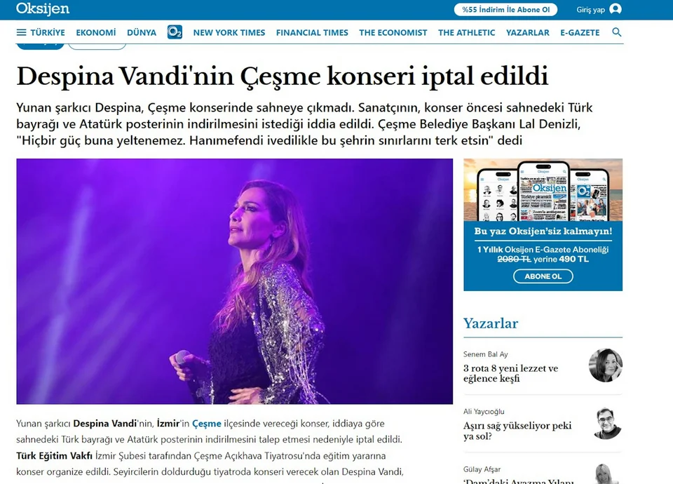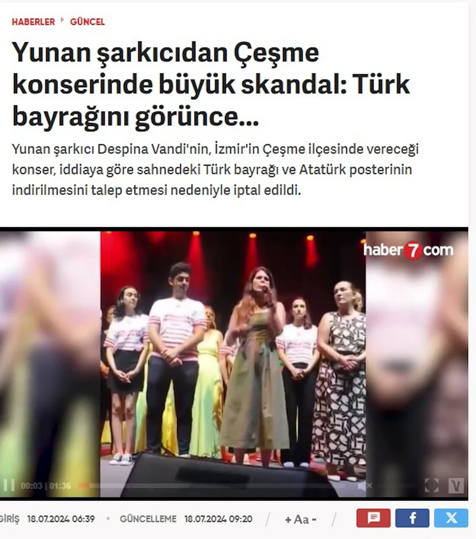 «Όταν είδε την τουρκική σημαία… Ακυρώθηκε η συναυλία της Ελληνίδας τραγουδίστριας Δέσποινας Βανδή στην περιοχή Τσεσμέ της Σμύρνης, επειδή φέρεται να απαίτησε να κατέβουν η τουρκική σημαία και η αφίσα του Ατατούρκ στη σκηνή».