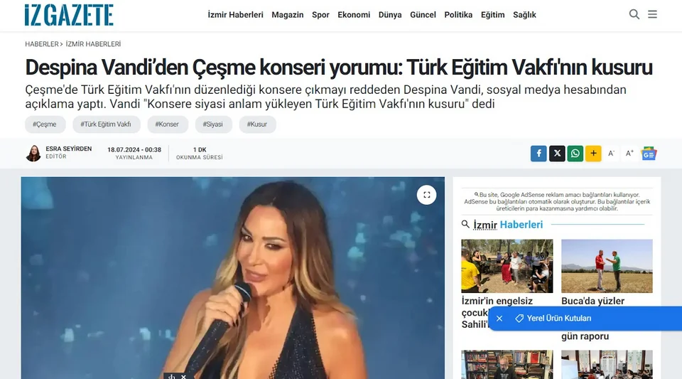 «Γιατί ακυρώθηκε η συναυλία της διάσημης Ελληνίδας τραγουδίστριας; Η Ελληνίδα τραγουδίστρια Δέσποινα Βανδή ακύρωσε τη συναυλία που είχε προγραμματιστεί για την ενίσχυση του Τουρκικού Ιδρύματος Παιδείας στο Τσεσμέ της Σμύρνης».