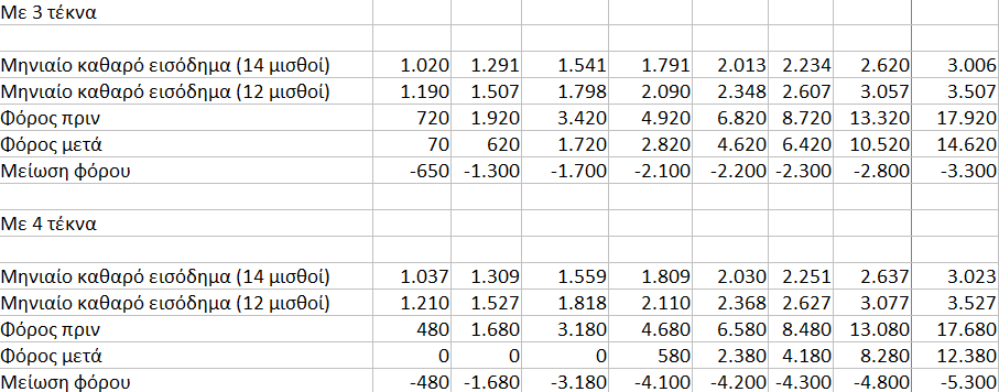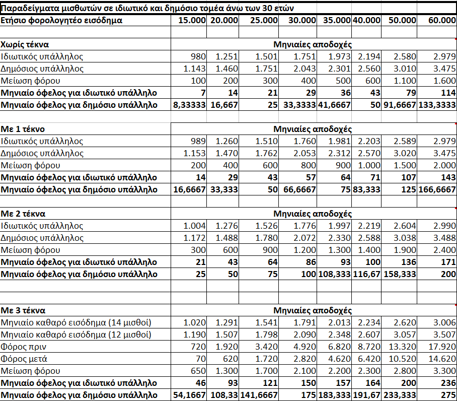 - Μισθωτοί άνω των 30 ετών. θα έχουν υψηλότερες καθαρές αποδοχές λόγω της μείωση των φορολογικών συντελεστών. Για παράδειγμα, μισθωτός του ιδιωτικού τομέα με δύο παιδιά και φορολογητέο εισόδημα 30.000 ευρώ δηλαδή 1.776 ευρώ καθαρά τον μήνα θα έχει όφελος 85,71 ευρώ το μήνα ή 1.200 ευρώ το χρόνο, δηλαδή περίπου τα δύο τρίτα ενός μισθού. Τρίτεκνος που εργάζεται στον ιδιωτικό τομέα, με καθαρές αποδοχές 1.291 ευρώ, θα δει μείωση φόρου 1.300 ευρώ ή 92,86 ευρώ το μήνα. Δηλαδή, το επόμενο έτος θα έχει όφελος σχεδόν έναν μισθό. Πολύτεκνος με μισθό 1.800 ευρώ θα κερδίσει 4.100 ευρώ, δηλαδή σχεδόν 2,3 μισθούς.