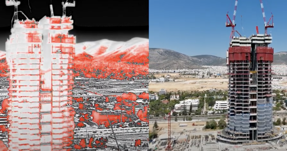 Αποκαλυπτικό βίντεο drone με θερμική κάμερα πάνω από τα μεγαλύτερα εργοτάξια της Αθήνας δείχνει πόσο ζεστό είναι το έδαφος εκτός συνθήκες καύσωνα, αλλά και πόσους βαθμούς εκπέμπει ένα μηχάνημα έργου δίπλα σε έναν εργάτη. Ουσιαστικά, τίθεται το ερώτημα «ποιο είναι πραγματικά το θερμικό φορτίο που "κρύβεται" στα μεγάλα εργοτάξια της Αθήνας»;