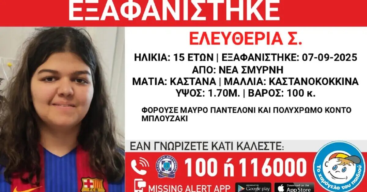 Εξαφανίστηκε η 15χρονη Ελευθερία από δομή φιλοξενίας στη Νέα Σμύρνη το μεσημέρι της Κυριακής 7 Σεπτεμβρίου σύμφωνα με το σύμφωνα με το «Χαμόγελο του Παιδιού».