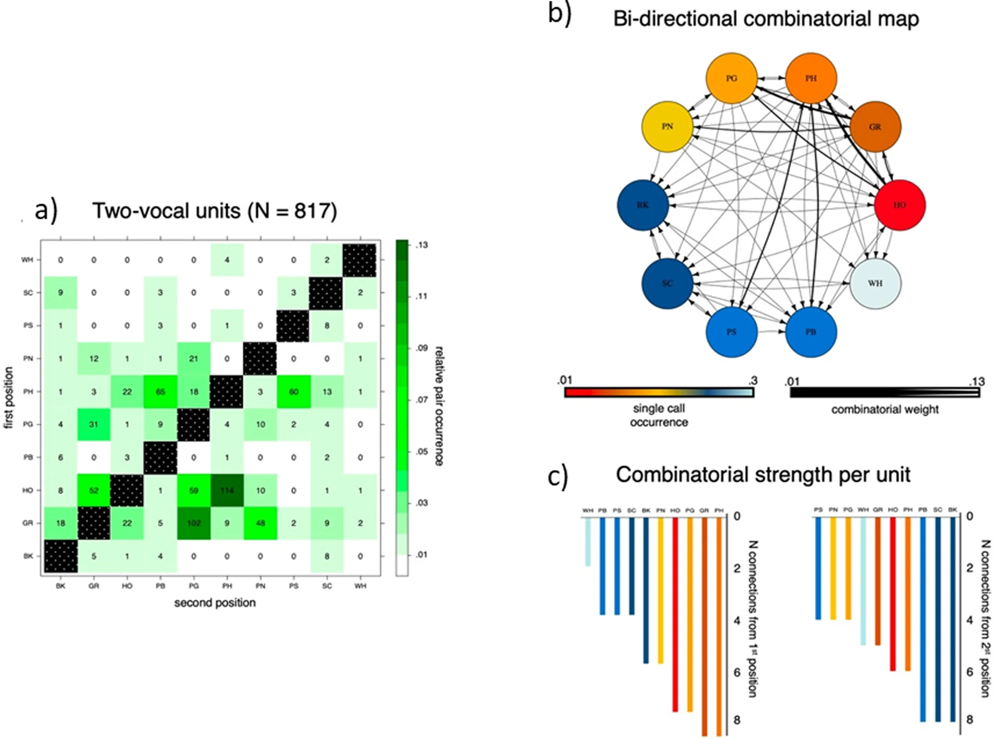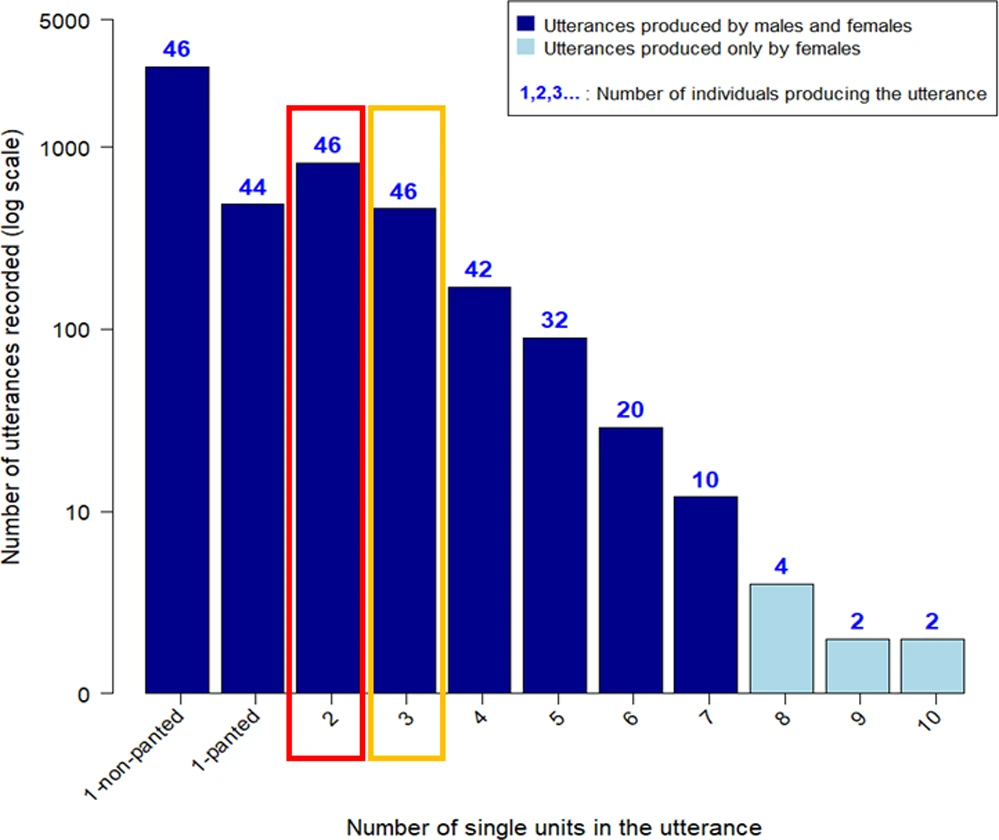 Στην έρευνα, οι επιστήμονες μέτρησαν πώς οι χιμπατζήδες συνδυάζουν μεμονωμένους ήχους σε σειρά, τη σειρά αυτών των ήχων και τον ανασυνδυασμό τους για να δημιουργήσουν ακόμα μεγαλύτερες “προτάσεις”. Έπειτα μελέτησαν το συνδυασμό αυτών των προτάσεων αποκαλύπτοντας 12 διαφορετικές προτάσεις οι οποίες σήμαιναν διαφορετικά πράγματα, ανάλογα το πώς χρησιμοποιούνταν και ανάλογα τις συνθήκες στις οποίες έλαβε χώρα η επικοινωνία.