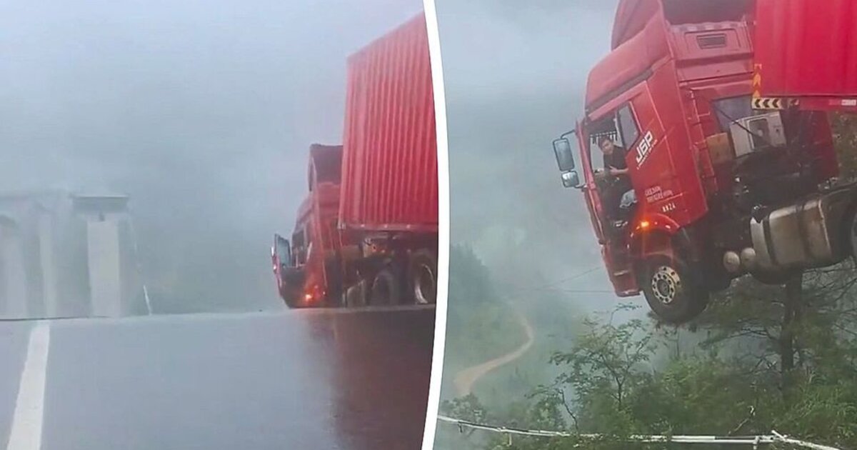 Σοκαριστικά πλάνα δείχνουν την καμπίνα της νταλίκας με τον οδηγό στο χείλος του γκρεμού.