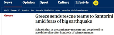 Ο Guardian αναφέρει ότι «η Ελλάδα έχει στείλει σωστικά συνεργεία στη Σαντορίνη λόγω φόβων για μεγαλύτερο σεισμό». Το δημοσίευμα επισημαίνει ότι «εν μέσω ανησυχιών για πιθανό μεγαλύτερο σεισμό που θα μπορούσε να προκαλέσει τσουνάμι, οι πολίτες έχουν κληθεί να αποφεύγουν τις ακτές και τα ετοιμόρροπα κτίρια, να αδειάζουν τις πισίνες τους και να αποφεύγουν να συγκεντρώνονται σε μεγάλους αριθμούς σε κλειστούς χώρους».
