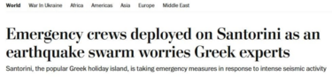 Το Associated Press, σε δημοσίευμά του με τίτλο «Emergency crews deployed on Santorini as an earthquake swarm worries Greek experts» (Συνεργεία έκτακτης ανάγκης αναπτύχθηκαν στη Σαντορίνη καθώς ένα “σμήνος” σεισμών ανησυχεί τους Έλληνες εμπειρογνώμονες), τονίζει ότι οι ελληνικές αρχές έχουν κινητοποιήσει σωστικά συνεργεία στο νησί λόγω της έντονης σεισμικής δραστηριότητας.