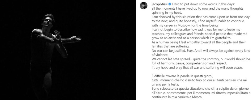 Με ανακοίνωσή του στον προσωπικό του λογαριασμό Instagram ο Ιταλός Jacopo Tissi, πρώτος χορευτής του Θεάτρου Μπολσόι στη Μόσχα, δήλωσε πως εγκαταλείπει τη θέση του.