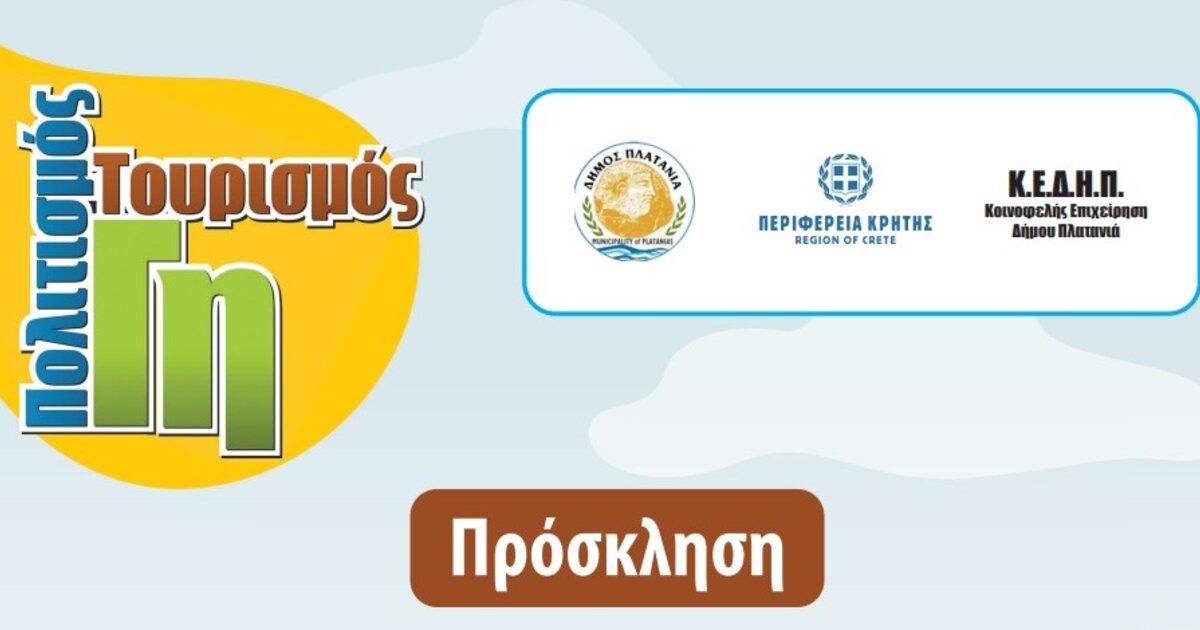 Ο Δήμος Πλατανιά και η Κοινωφελής Επιχείρηση Δήμου Πλατανιά (Κ.Ε.Δ.Η.Π.), σε συνεργασία με την Περιφέρεια Κρήτης και με την υποστήριξη των τοπικών φορέων, διοργανώνουν το 15ο Φεστιβάλ «Γη – Πολιτισμός – Τουρισμός», την Κυριακή 21 Σεπτεμβρίου 2025, στις 19:30, στην πλατεία του Πλατανιά.