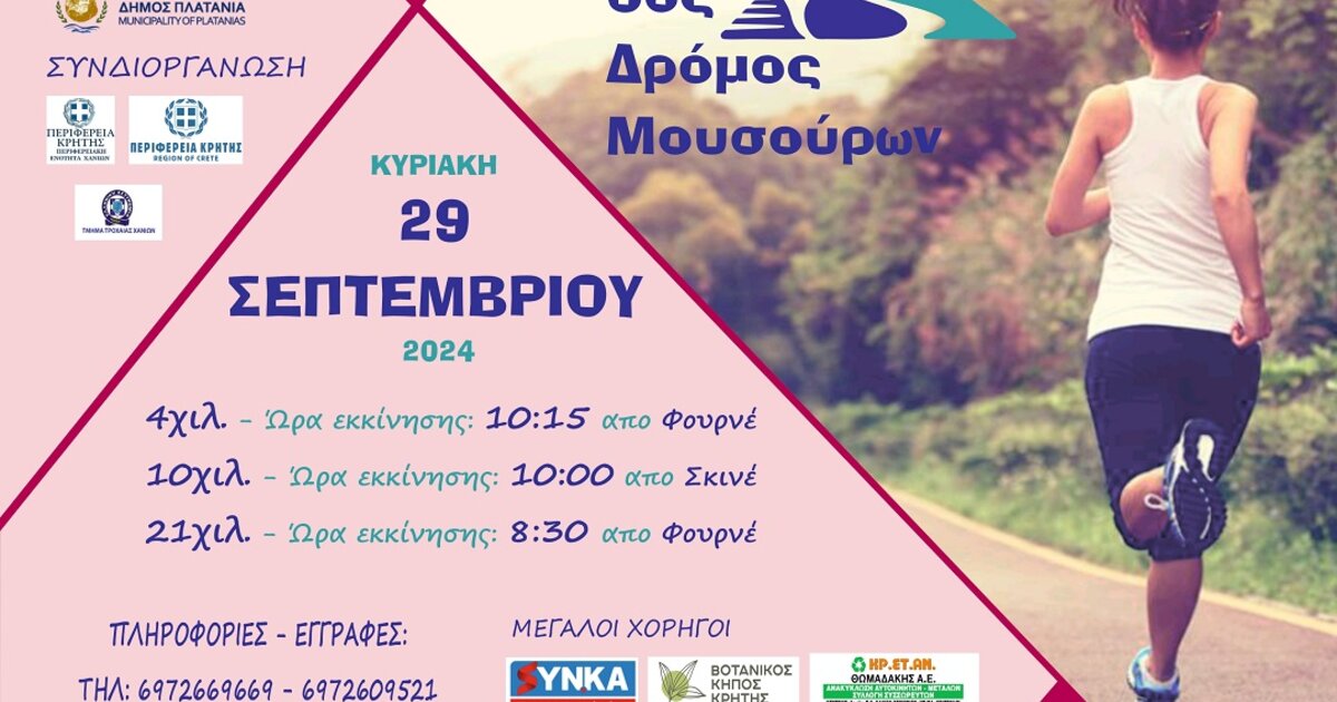O Δήμος Πλατανιά σε συνεργασία με το Σύλλογο Δρομέων Υγείας Χανίων και συνδιοργανωτή την Περιφέρεια Κρήτης, καθώς και την υποστήριξη της ΕΛΑΣ, του Ερυθρού Σταυρού και του ΣΥ.ΦΑ.Χ., πραγματοποιούν για 6η χρονιά τον Αγώνα “Δρόμος Μουσούρων” που θα διεξαχθεί την Κυριακή 29 Σεπτεμβρίου.