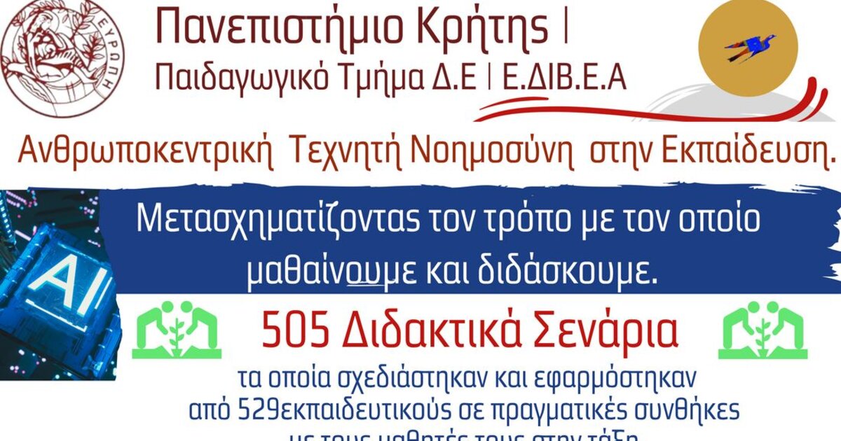 Τα διδακτικά σενάρια για την παιδαγωγική αξιοποίηση της Ανθρωποκεντρικής Τεχνητής Νοημοσύνης στο Γυμνάσιο και στο Λύκειο Δημοτικό Σχολείο, είναι πλέον ανοιχτά και προσβάσιμα όπως γνωστοποίησε το Κέντρο Επιμόρφωσης και Διά Βίου Μάθησης του Πανεπιστημίου Κρήτης.