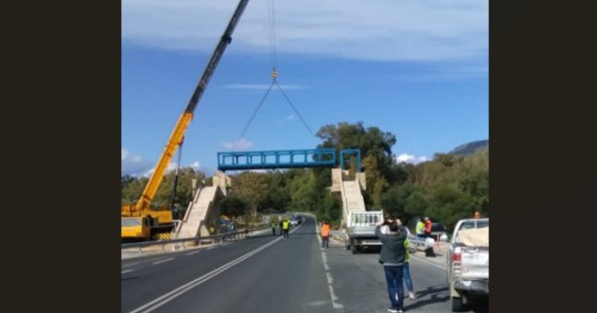 Οι εργασίες ανάρτησης και εγκατάστασης της πεζογέφυρας πραγματοποιήθηκαν με επιτυχία από την ανάδοχο εταιρεία ΔΟΜΙΚΗ ΚΡΗΤΗΣ Α.Ε., τη Δευτέρα 24 Νοεμβρίου 2025, με ολιγόλεπτη διακοπή της κυκλοφορίας, σύμφωνα με τον εγκεκριμένο σχεδιασμό και την προβλεπόμενη εργοταξιακή σήμανση.