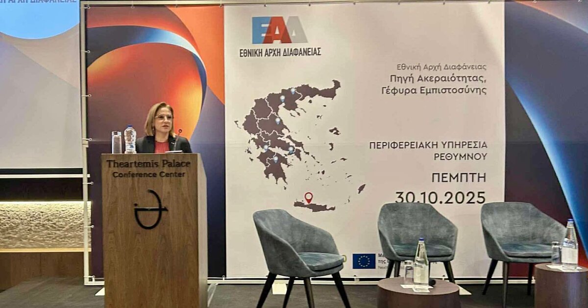 Στην εκδήλωση της Ενιαίας Αρχής Διαφάνειας (ΕΑΔ) στο Ρέθυμνο, παρουσία της Διοικήτριας Αλεξάνδρας Ρογκάκου, παρευρέθηκε η Γραμματέας της Αποκεντρωμένης Διοίκησης Κρήτης, Μαρία Κοζυράκη. Η ενημερωτική εκδήλωση «Εθνική Αρχή Διαφάνειας: Πηγή ακεραιότητας, Γέφυρα εμπιστοσύνης» αποτελεί την πρώτη από μία σειρά ημερίδων που θα πραγματοποιηθούν στις πόλεις όπου η ΕΑΔ λειτουργεί περιφερειακές υπηρεσίες.