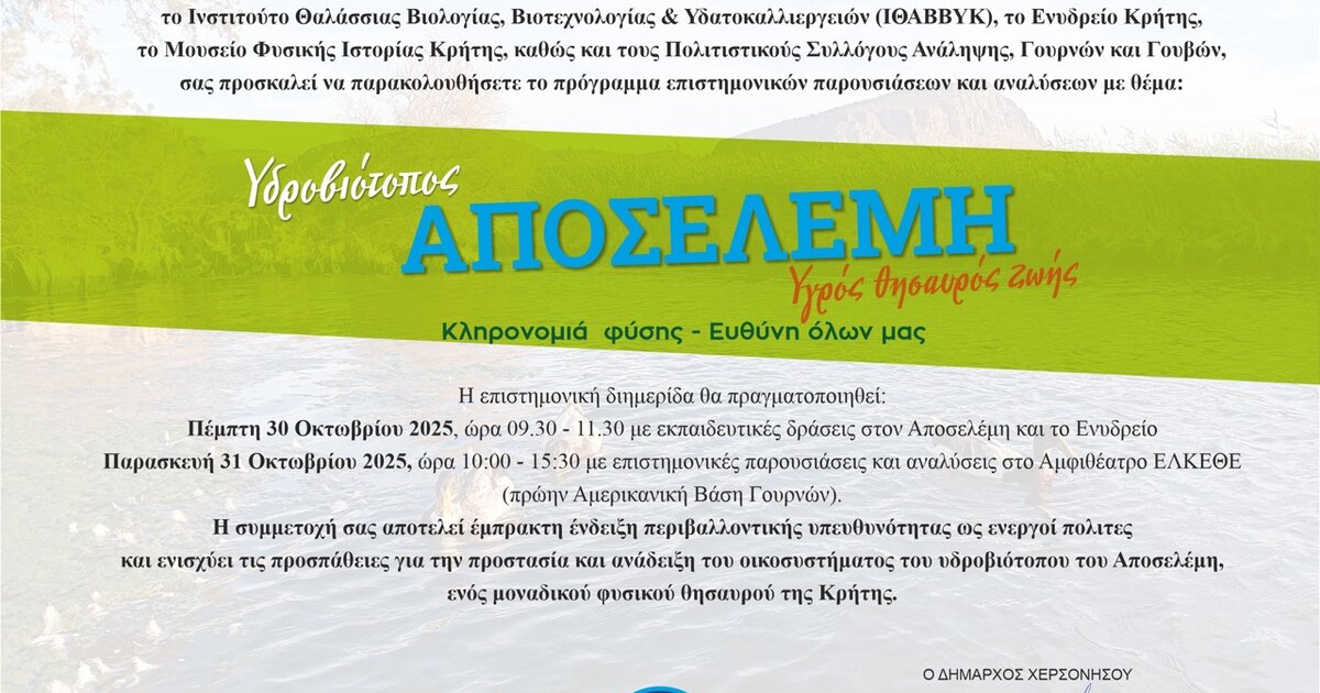 «Υδροβιότοπος Αποσελέμη – Υγρός θησαυρός ζωής. Κληρονομιά φύσης – Ευθύνη όλων μας» είναι ο τίτλος επιστημονικής διημερίδας που διοργανώνουν ο Δήμος Χερσονήσου, σε συνεργασία με την Περιφέρεια Κρήτης, το Ελληνικό Κέντρο Θαλάσσιων Ερευνών – ΕΛΚΕΘΕ, το Ινστιτούτο Θαλάσσιας Βιολογίας, Βιοτεχνολογίας και Υδατοκαλλιεργειών (ΙΘΑΒΒΥΚ), το Ενυδρείο Κρήτης, το Μουσείο Φυσικής Ιστορίας Κρήτης, καθώς και τους Πολιτιστικούς Συλλόγους Ανάληψης, Γουρνών και Γουβών.