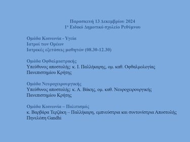 Στο 1ο Ειδικό Δημοτικό Σχολείο Ρεθύμνου να βρεθεί την Παρασκευή 13 Δεκεμβρίου το Πανεπιστήμιο των Ορέων. Οι ομάδες των καθηγητών γιατρών και νοσηλευτών του Πανεπιστημίου Κρήτης θα εξετάσουν μαθητές του σχολείου, κατά το ακόλουθο πρόγραμμα: