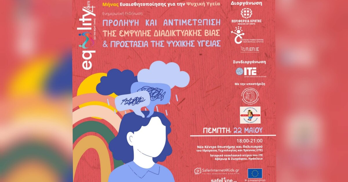 Με αφορμή τον μήνα ευαισθητοποίησης για την ψυχική υγεία η Περιφέρεια Κρήτης, Αυτοτελές Γραφείο Ισότητας και το Ίδρυμα Τεχνολογίας και Έρευνας (ΙΤΕ) συνδιοργανώνουν ενημερωτική εκδήλωση για την πρόληψη και αντιμετώπιση της διαδικτυακής βίας και την προστασία της ψυχικής υγείας παιδιών και εφήβων, την Πέμπτη 22 Μαΐου 2025, ώρα 6:00-9:00μ.μ., στο Κέντρο Επιστήμης και Πολιτισμού του ΙΤΕ, στο νεοκλασικό κτίριο στο κέντρο του Ηρακλείου (Αβέρωφ και Ζωγράφου).