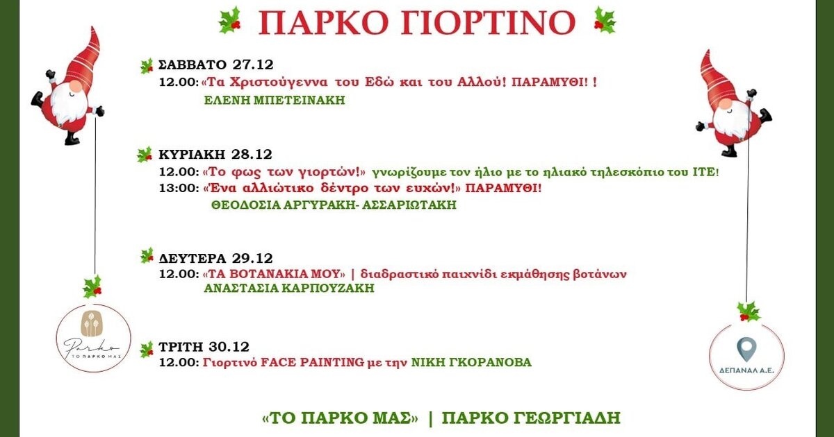 Το δικό της «Πάρκο γιορτινό» ετοίμασε η ΔΕΠΑΝΑΛ Α.Ε. στο Πάρκο Γεωργιάδη στο Ηράκλειο με παραμύθια, ταξίδια στον χριστουγεννιάτικο ουρανό, ευχές αγάπης, μυρωδιές και γεύσεις από κρητικά βοτάνια αλλά και πολύ χρώμα και ομορφιά! Οι δράσεις αυτές- όλες δωρεάν- ξεκινούν το Σάββατο 27 Δεκεμβρίου και ολοκληρώνονται την Τρίτη 30 Δεκεμβρίου, πρόπαραμονή Πρωτοχρονιάς. Στον χώρο του Πάρκου Γεωργιάδη, μικροί και μεγάλοι θα μπορέσουν να απολαύσουν μία γιορτινή βόλτα και να δώσουν στα παιδιά τη χαρά του παιγνιδιού και της γνώσης.