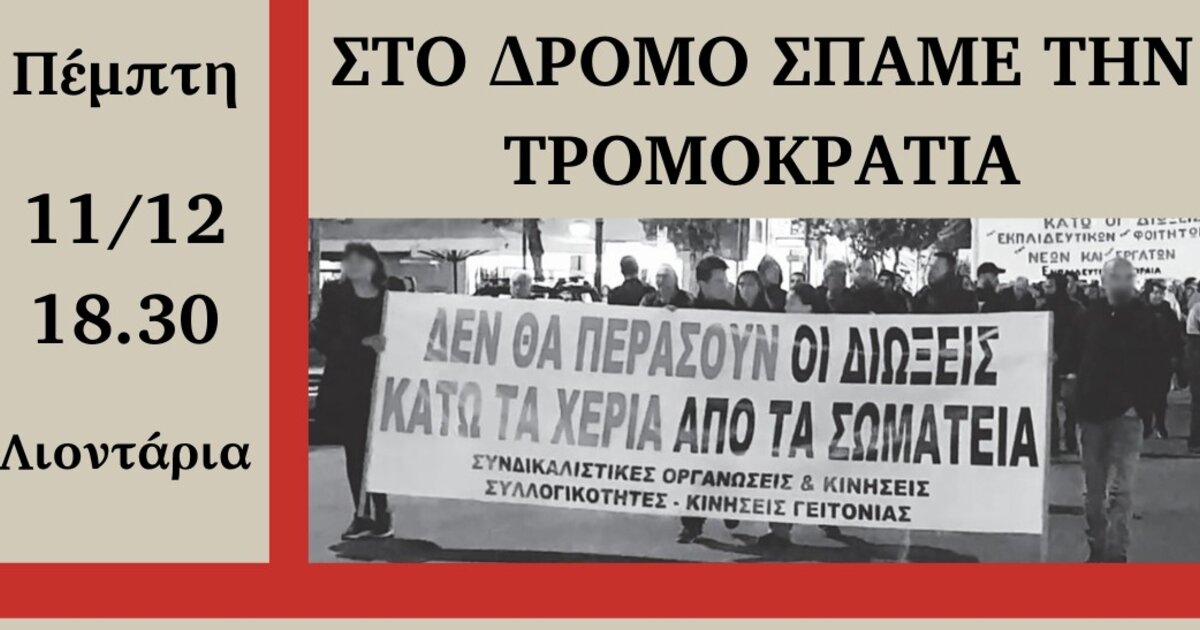 Κάλεσμα σε συγκέντρωση, αυτή την Πέμπτη 11 Δεκεμβρίου, στις 6 και μισή το απόγευμα στα Λιοντάρια