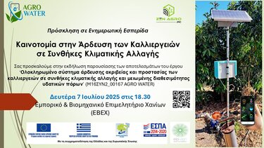 Θα παρουσιασθούν τα αποτελέσματα του έργου ‘Ολοκληρωμένο σύστημα άρδευσης ακριβείας και προστασίας των καλλιεργειών σε συνθήκες κλιματικής αλλαγής και μειωμένης διαθεσιμότητας υδατικών πόρων’ (Μ16ΣΥΝ2_00167 AGROWATER, Πρόγραμμα Αγροτικής Ανάπτυξης ΠΑΑ-ΕΣΠΑ 2014-2020.