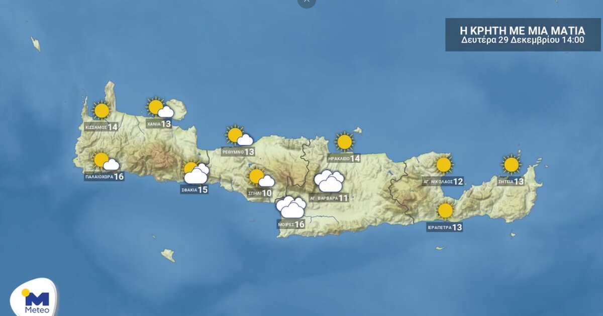 Για τη Δευτέρα 29 Δεκεμβρίου 2025 προβλέπεται ηλιοφάνεια με λίγες νεφώσεις, αυξημένες στα ανατολικά και νότια τμήματα, με πιθανότητα τοπικών βροχών σε Σποράδες, Νότια Πελοπόννησο, στα βόρεια και ορεινά τμήματα της Κρήτης και πιθανόν στις Κυκλάδες.