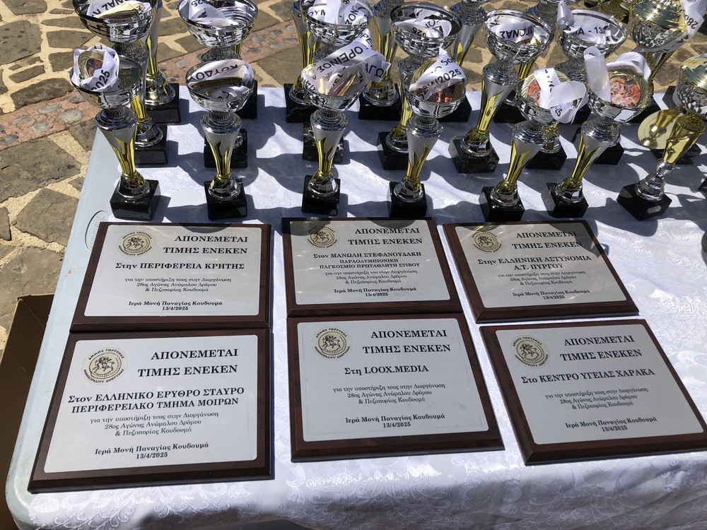 Στους νικητές κάθε κατηγορίας δόθηκαν κύπελλα, μετάλλια και αναμνηστικά δώρα, ενώ σε όλους τους αθλητές και πεζοπόρους δόθηκαν αναμνηστικά μετάλλια και διπλώματα συμμετοχής. Για την πολύτιμη συνεισφορά τους στην υλοποίηση του αγώνα βραβεύτηκαν, με τιμητικές πλακέτες, η Περιφέρεια Κρήτης, το Κέντρο Υγείας Χάρακα, ο Ελληνικός Ερυθρός Σταυρός - Σώμα Εθελοντών, Σαμαρειτών Διασωστών και Ναυαγοσωστών Μοιρών, η Ελληνική Αστυνομία (Α.Τ. Πύργου) και ο Οργανισμός Έρευνας & Καινοτομίας Loox.Media. Βραβεύτηκε, επίσης, για τις διακρίσεις και την προσφορά του στον αθλητισμό, ο παραολυμπιονίκης και παγκόσμιος πρωταθλητής, Μανώλης Στεφανουδάκης.