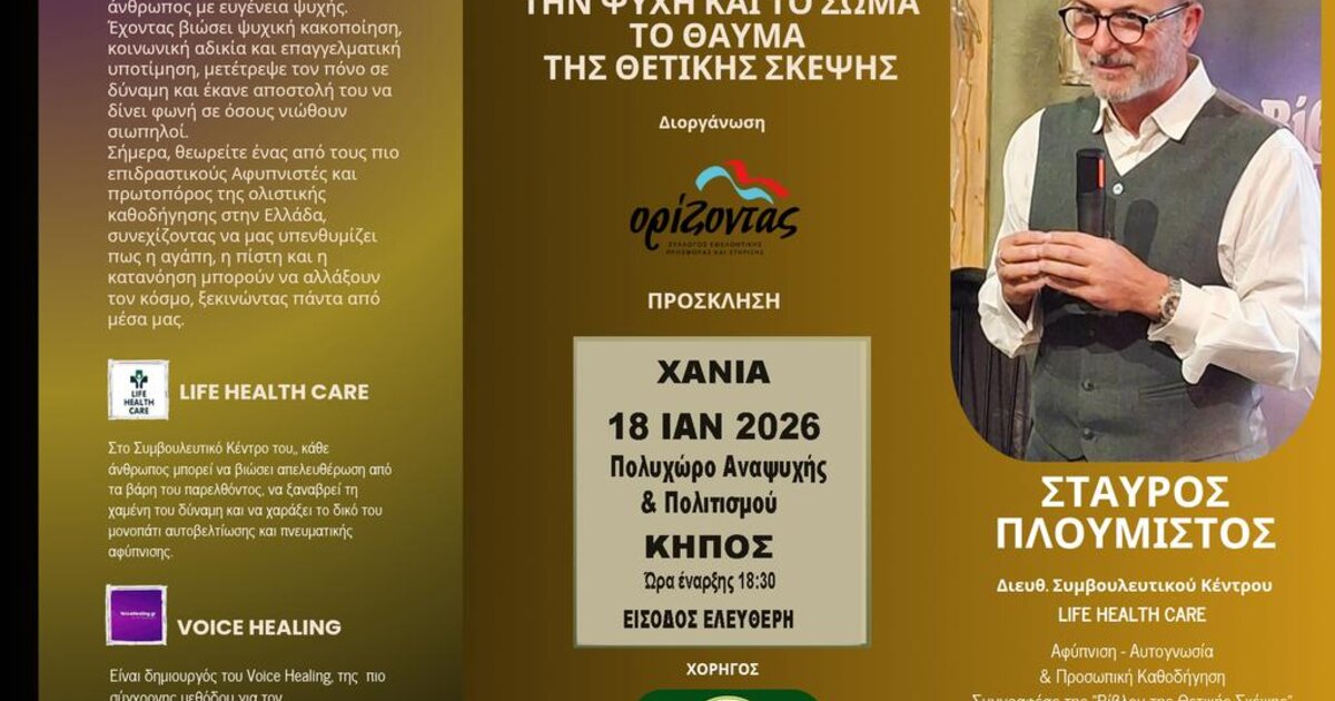 Εκδήλωση από τον Σύλλογο Εθελοντικής Προσφοράς και Στήριξης «Ορίζοντας, με ομιλητή τον Σταύρο Πλουμιστό, την Κυριακή 18 Ιανουαρίου 2026, στον Πολυχώρο Πολιτισμού “Κήπος” στα Χανιά, στις 18:30.