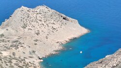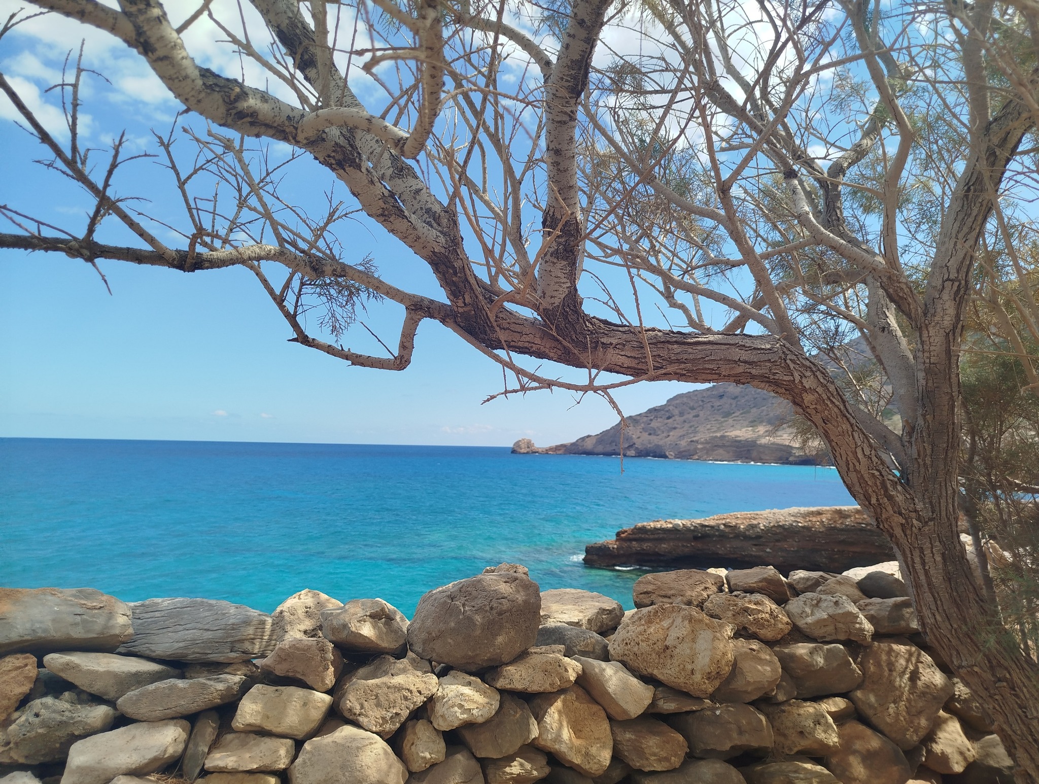 Κατηφορίζουμε κι άλλο, ώσπου βρίσκουμε τον αγροτικό δρόμο, που περνάει από την παραλία ‘Μεγάλη Πατσάβρα’ και τη γειτονική ‘Ξεπαπαδιά’ με το εκκλησάκι του Αγίου Διονυσίου να λάμπει κάτω απ’ τον μεσημεριανό ήλιο. Εντυπωσιαζόμαστε από τους βραχώδεις σχηματισμούς και τους μικρούς κόλπους με τα τυρκουάζ νερά, που τα χαίρονται μόνο κάποιοι μοναχικοί ψαράδες. Το ψάρι πρέπει να είναι άφθονο εδώ με τόσες σπηλιές, ξέρες και βράχους! «Κοίτα εκεί ένα κοπάδι, μάλλον είναι κέφαλοι», μου δείχνει η Τερέζα, που αν και μένει στο Τέξας, έζησε πολλά χρόνια της ζωής της εδώ δίπλα στους ντόπιους ψαράδες. Πραγματικά καμιά δεκαριά μεγάλα ψάρια φαίνονται από ψηλά να τσιμπολογάνε κάτι!!!
