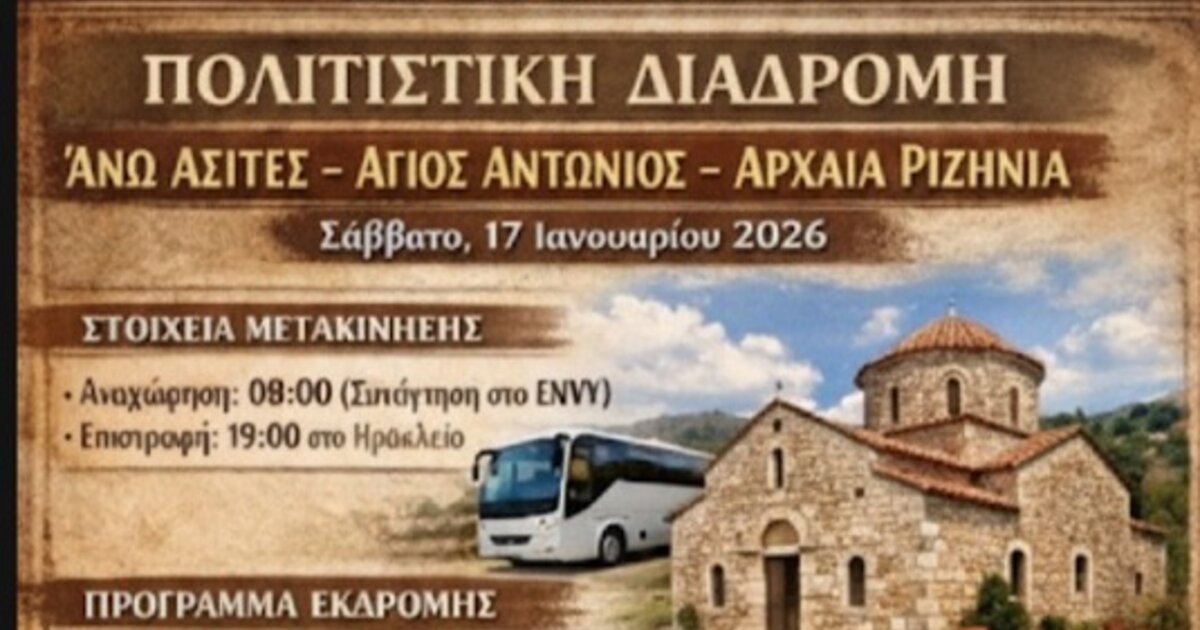 Μια ενδιαφέρουσα πολιτιστική διαδρομή στο χωριό Άνω Ασίτες διοργανώνει η Αντιδημαρχία Εθελοντισμού του Δήμου Ηρακλείου σε συνεργασία με την εθελοντική ομάδα «Φιλόπολις» το Σάββατο 17 Ιανουαρίου με αφορμή την γιορτή του Αγίου Αντωνίου.