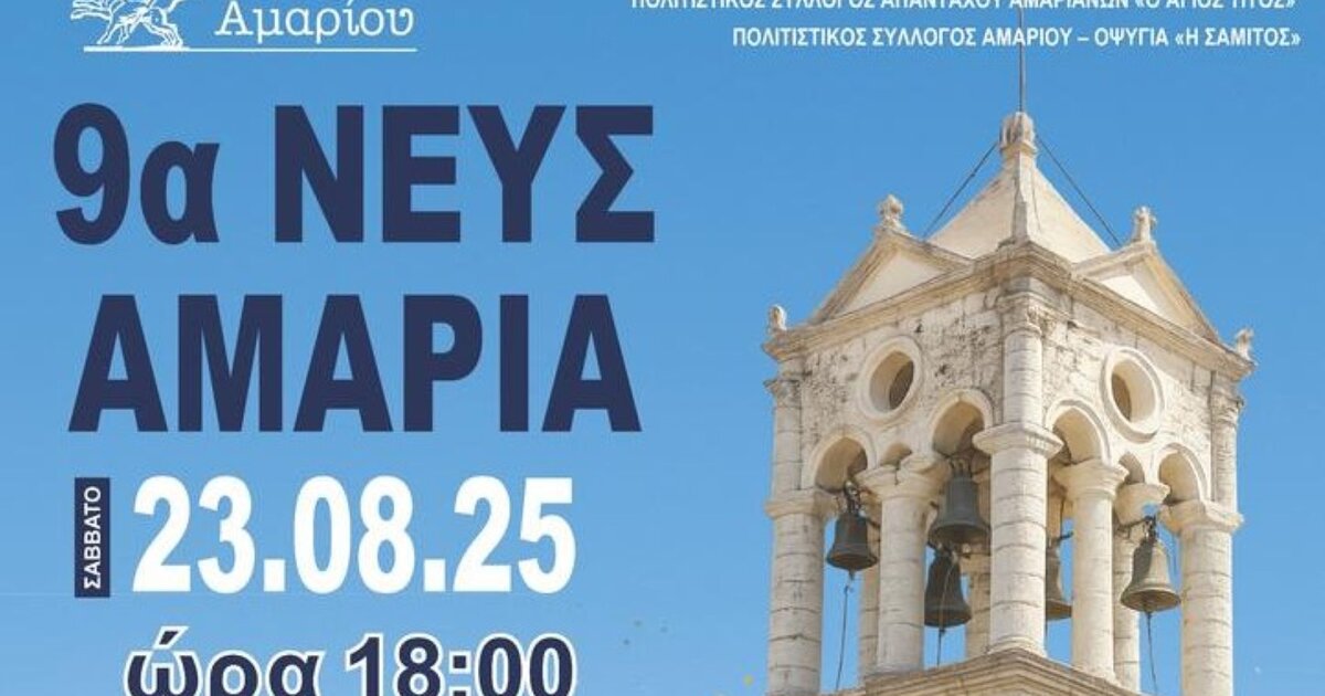 Ο Δήμος Αμαρίου σε συνεργασία με τον Πολιτιστικό Σύλλογο απανταχού Αμαριανών ο "ΑΓΙΟΣ ΤΙΤΟΣ" και τον Πολιτιστικό Σύλλογο Αμαρίου - Οψιγιά "Η ΣΑΜΙΤΟΣ" διοργανώνουν τους αγώνες Λαϊκούς αγώνες δρόμου "9α ΝΕΥΣΑΜΑΡΙΑ", στις 23 Αυγούστου 2025, ημέρα Σάββατο και ώρα 6:00 μ.μ. στο Νευς Αμάρι, στο πλαίσιο των εκδηλώσεων της γιορτής του Αγίου Τίτου, με ελεύθερη συμμετοχή στις παρακάτω κατηγορίες: