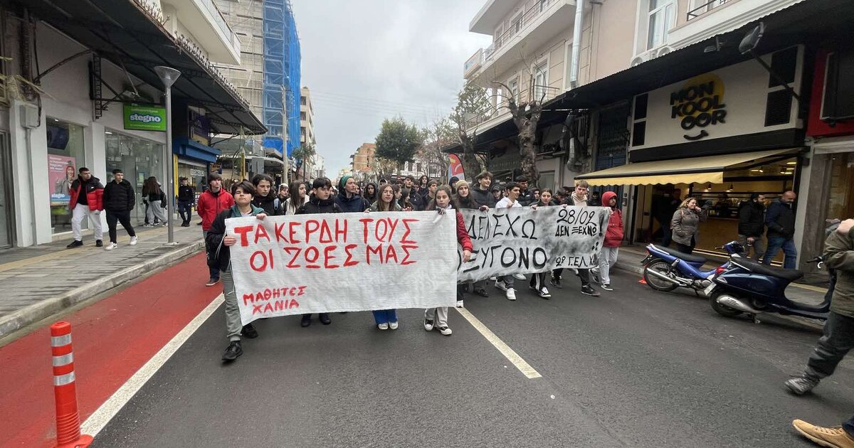 Μαθητές βγήκαν στους δρόμους και των Χανίων, το πρωί της Παρασκευής, στο πλαίσιο του νέου γύρου κινητοποιήσεων με αιχμή την τραγωδία των Τεμπών.