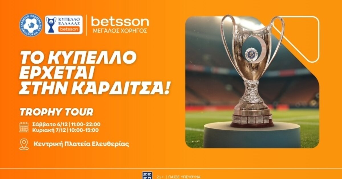 Το ταξίδι του BetssonTrophy Tour συνεχίζεται και, μετά από τρεις δυναμικές στάσεις, η Καρδίτσα ετοιμάζεται να υποδεχθεί το τρόπαιο του Κυπέλλου Ελλάδας Betsson στις 6 και 7 Δεκεμβρίου. Μία πόλη με έντονη αθλητική κουλτούρα γίνεται το επόμενο σημείο συνάντησης για όλους και θα έχουν την ευκαιρία να ζήσουν από κοντά αυτή τη μοναδική εμπειρία.