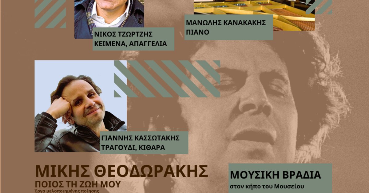 Τη Δευτέρα 1 Σεπτεμβρίου 2025 δίνουμε ραντεβού στον κήπο του Ιστορικού Μουσείου Κρήτης με μια βραδιά ποίησης και μουσικής, αφιερωμένη στον Μίκη Θεοδωράκη. Παραμονή της επετείου θανάτου του συνθέτη, ο Γιάννης Κασσωτάκης, ο Νίκος Τζώρτζης και ο Μανώλης Κανακάκης θα μας ταξιδέψουν, με μία παράσταση μουσικής και λόγου, στο έργο του Μίκη Θεοδωράκη.