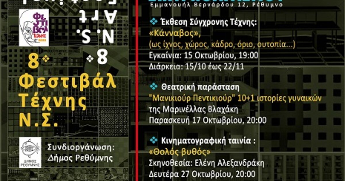 Το 8ο Φεστιβάλ Τέχνης Ν.Σ. 2025 (8o N.S. Art Festival 2025) που έχει ως γενικό θέμα τον Κάνναβο, σε συνδιοργάνωση με το Τμήμα Πολιτισμού του Δήμου Ρεθύμνης ανοίγει της πύλες του και καλεί στις εκδηλώσεις που ξεκινούν στις 7 Οκτωβρίου 2025 και ολοκληρώνονται στις 30 Νοεμβρίου.