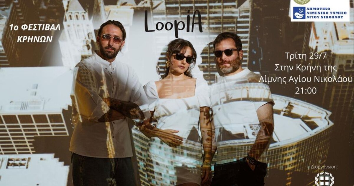 Oι Loopia με την υποστήριξη του Δήμου Αγίου Νικολάου και της Περιφέρειας Κρήτης διοργανώνουν συναυλία την Τρίτη 29 Ιουλίου 2025 στην παλαιά κρήνη στη Λίμνη Αγίου Νικολάου. Ένα ακουστικό μουσικό ταξίδι με στοιχεία από jazz, funk, pop και soul μέχρι ηχοχρώματα και αίσθηση σινεματικής μουσικής.