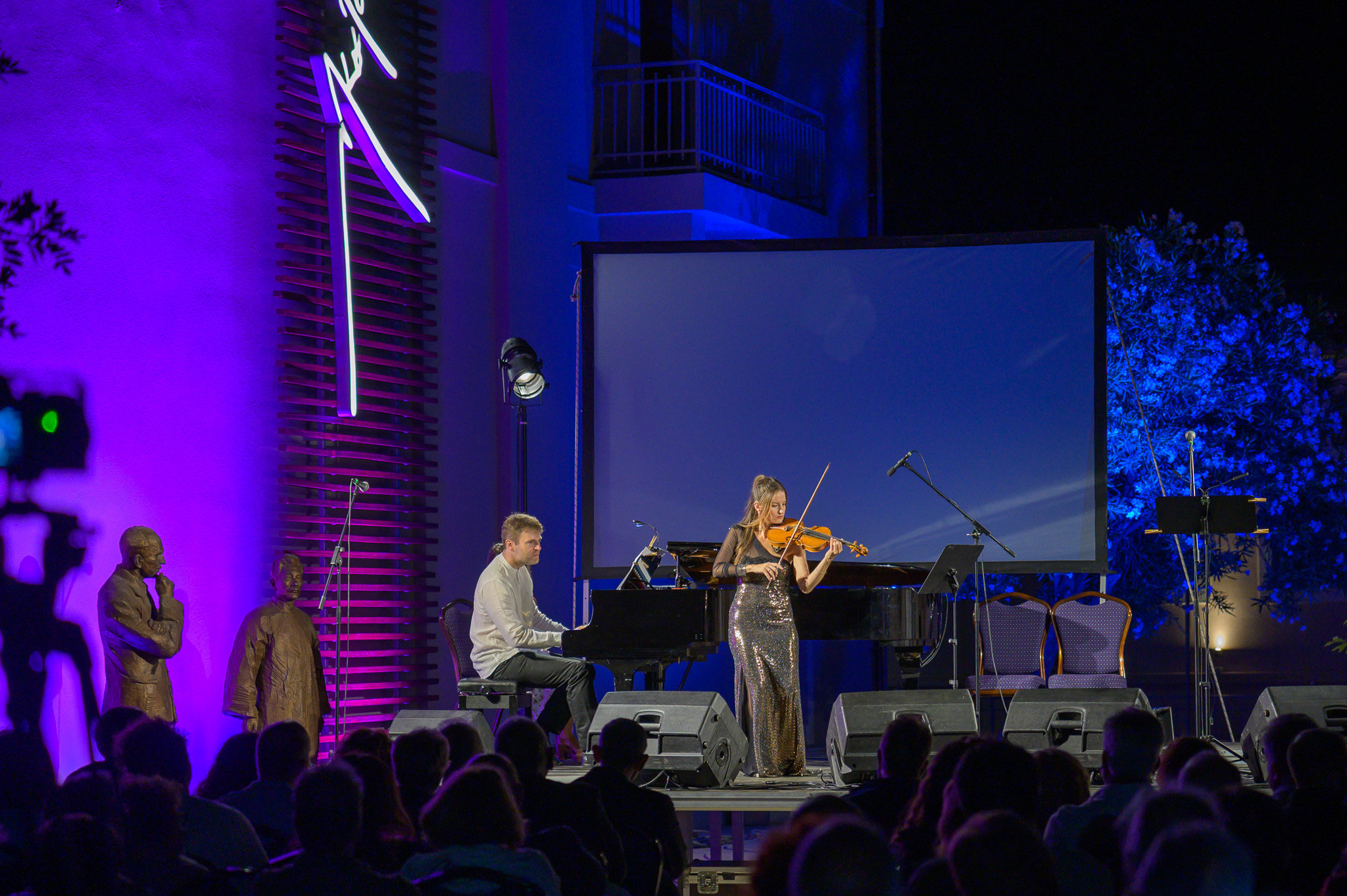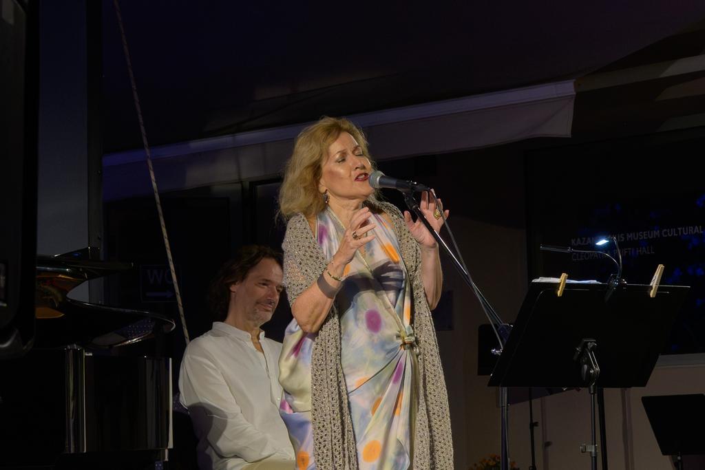 Η Κατερίνα Χατζηνικολάου, εξάρχουσα της κρατικής ορχήστρας Αθηνών, ο Απόστολος Παληός, διακεκριμένος πιανίστας και ο Τάσος Αποστόλου, βαρύτονος της Εθνικής Λυρικής σκηνής, ερμήνευσαν συνθέσεις του σπουδαίου μαέστρου Δημήτρη Μητρόπουλου, ο οποίος το 1925 επισκέφτηκε την Κνωσό συνοδευόμενος από τον Νίκο Καζαντζάκη. Στο δεύτερο μέρος η αισθαντική Έλλη Πασπαλά και ο Τάσος Αποστόλου ερμήνευσαν λυρικά και πασίγνωστα τραγούδια του Μίκη Θεοδωράκη με τη συνοδεία του σπουδαίου κρητικού μαέστρου Μίλτου Λογιάδη στο πιάνο. Η κατάμεστη αυλή του Μουσείου σιγοτραγούδησε συγκινημένη μαζί τους τα θρυλικά τραγούδια του Μίκη Θεοδωράκη.