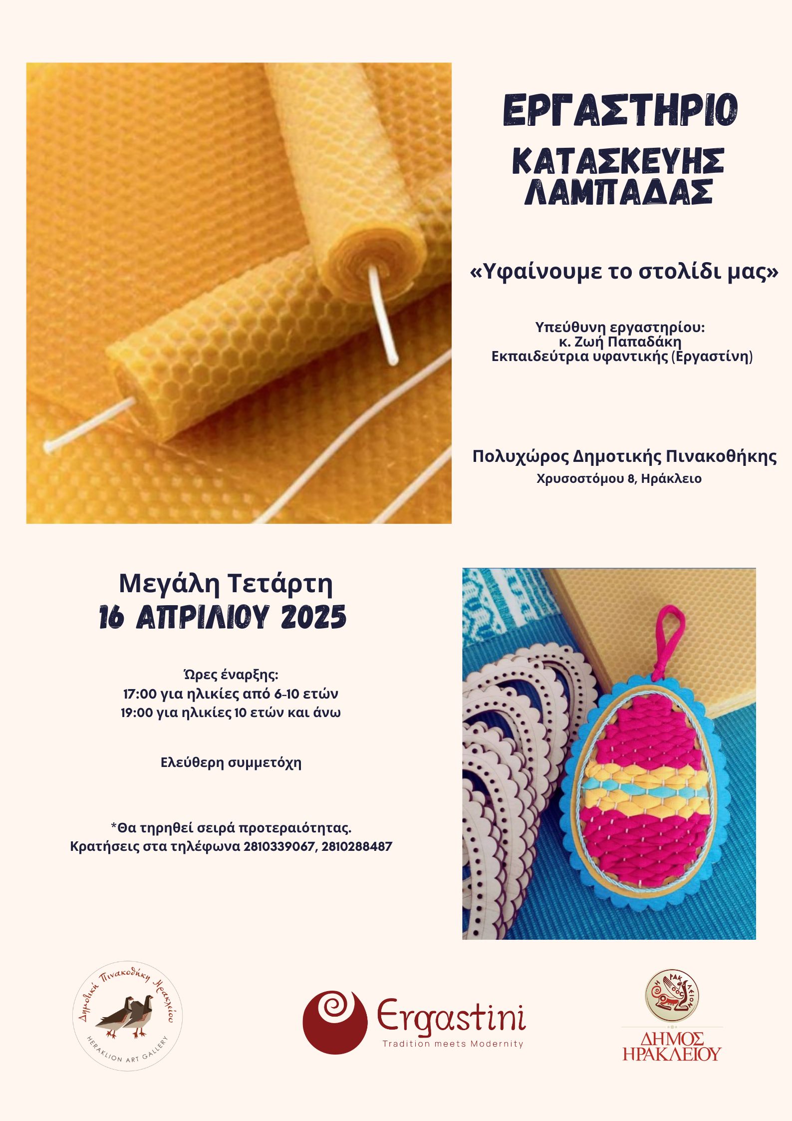 Η Δημοτική Πινακοθήκη Ηρακλείου σε συνεργασία με το εργαστήριο υφαντικής Εργαστίνη και την εκπαιδεύτρια υφαντικής κ. Ζωή Παπαδάκη διοργανώνουν εργαστήριο πασχαλινής λαμπάδας την Μεγάλη Τετάρτη 16 Απριλίου, στον Πολυχώρο της Δημοτικής Πινακοθήκης, Χρυσοστόμου 8.